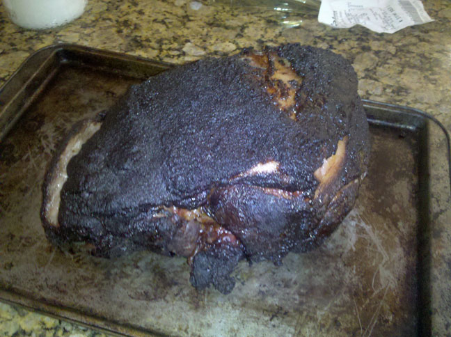 Here is my sad pork butt, it was pretty easy to scrape off the stuff on the outside...the meat is awesome! Super moist and tastes great!