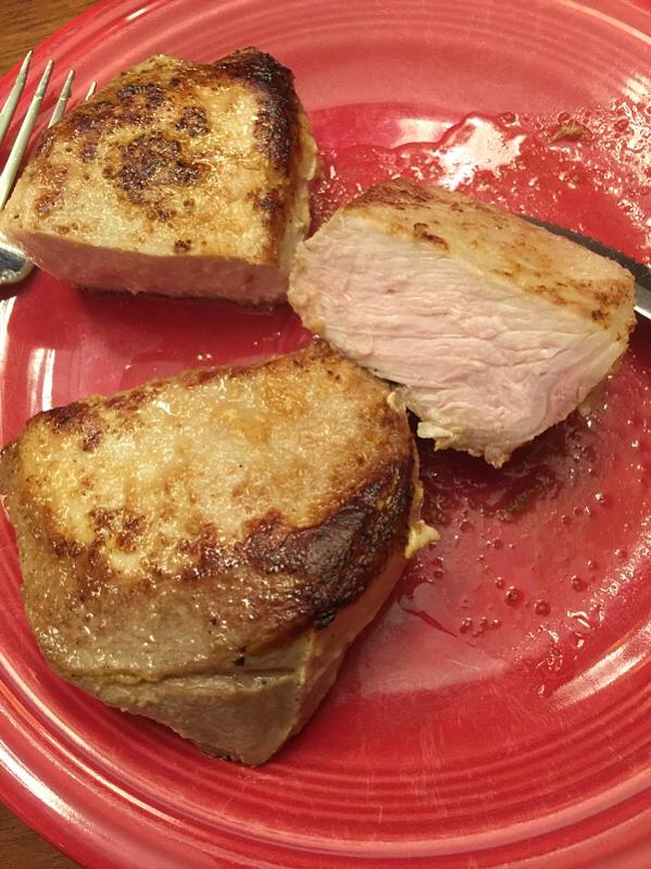 I made some pork loin chops (from Costco) seasoned with salt and crushed garlic at 140* for an hour, then seared 60 seconds on a side in lard: