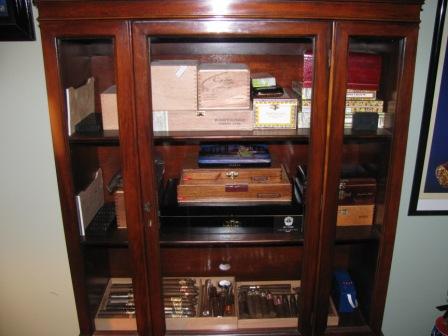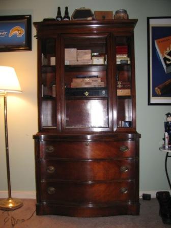 While wandering through a local antique store i found a beautiful old glass front china hutch for a steal. I thought to myself that it would make a great humidor. $163 and some weather stripping later i was in possesion of the 9 cubic foot humidor you see here. Of course i needed to fill it and went on a imediate shopping spree.