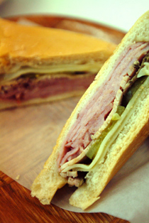 Attachment 5564 Jorge Castillo: One thing is certain. Once you've had a Cuban sandwich, you'll crave them forever! Recipe from the book: "Three Guys From Miami Cook Cuban" Ingrediants: Cuban bread or (Substitute French bread if you must, but NOT a baguette!) Butter, softened 1 pound ham sliced (Use a good quality ham.) 1 pound lechón asado (roasted Cuban pork) sliced (Follow the lechón asado link or see the following recipe) 1/2 pound Swiss cheese, sliced (Use a mild Swiss -- we like Baby Swiss -- it has only a few holes.) Sliced dill pickles (dill "Sandwich Stackers" work great) Yellow mustard (optional) Mayonnaise (NEVER!!) To make four generous sandwiches: Preheat a pancake griddle or large fry pan. Cut the bread into sections about 8 inches long. Cut these in half and spread butter on both halves (inside). Make each sandwich with the ingredients in this order: pickles, roasted pork, ham, and cheese. Be generous! NOTE: Most people use a sweet cured ham (jamón dulce) or bolo ham for Cuban sandwiches. If you can find these hams in your area, great. Otherwise, look for a slightly sweet, soft textured ham with a mild taste. You don't want the flavor of the ham to overpower the rest of the ingredients! Also, never use shaved ham or pork in a Cuban sandwich! Place the sandwich on the hot griddle (fry pan) sprayed with a little "Pam" or lightly greased. Place a heavy iron skillet or bacon press on top of the sandwich to flatten. (You really want to smash the sandwich, compressing the bread to about 1/3 its original size!) Grill the sandwiches for two to three minutes on each side, until the cheese is melted and the bread is golden. Make sure your griddle or fry pan is not TOO HOT! Otherwise, the crust will burn before the cheese melts. Slice the sandwich in half diagonally and serve. Medianoche Use all the same ingredients, except use a medianoche bread loaf. This sweeter bread, and smaller size, is the only difference between a medianoche and a Cuban sandwich! NOTES: Tip: Let your meats and cheese come to room temperature. This way you avoid burning the bread and the cheese melts perfectly! This is especially helpful when you have a lot of meat in your sandwich. For extra flavor, sprinkle a little mojo (or meat juices if you make the recipe below) on the meat before adding the cheese. [u]Roasted Pork:[/U] Ingredients: (1) 2 to 4-pound pork shoulder roast OR pork loin roast (NOTE: You'll only need about 1 pound of the cooked meat for the Cuban sandwich recipe above.) 1 head garlic -- about 10 to 15 cloves 1 teaspoon salt 1 teaspoon black peppercorns 1 cup sour orange juice (If you can't get sour oranges in your area, use two parts fresh orange to one part fresh lemon and one part fresh lime) See Goya Shortcut Below! 1 cup minced onion 2 teaspoons oregano 1/2 cup Spanish olive oil Mash garlic, salt, and peppercorns into a paste, using a mortar and pestle. Stir in sour orange juice, onion, and oregano. Let sit at room temperature for 30 minutes. Heat the olive oil in a 2-quart saucepan until hot, but NOT deep frying hot! We’re looking for something in the neighborhood of 220 degrees F. Remove the oil from heat and quickly whisk in the garlic-orange juice mixture until well blended. Let cool before using as a marinade! Pierce pork roast as many times as you can with a sharp knife or fork. Pour garlic mixture (save a little for basting while roasting) over pork, cover and let sit in refrigerator for two to three hours. Using a suitable roasting pan or rack, sprinkle remaining marinade over pork and cook uncovered at 325°F. Roast until completely cooked (160°F), about 20 minutes per pound. Baste occasionally. Bring pan juices to a boil and simmer until the juice is reduced by half. Sprinkle some juice onto the pork when you put it in the sandwich. Simple Shortcut for marinade: Use: Goya Mojo Criollo Marinade available at most grocery stores in the mexican food section. It is a BitterOrange/Lemon/Garlic marinade. I add a couple of extra tablespoons of minced garlic and shake it in a zip-lock bag then put the roast in for24-48hours, the longer the better. http://www.goya.com/english/products...11&prodCatID=4 |