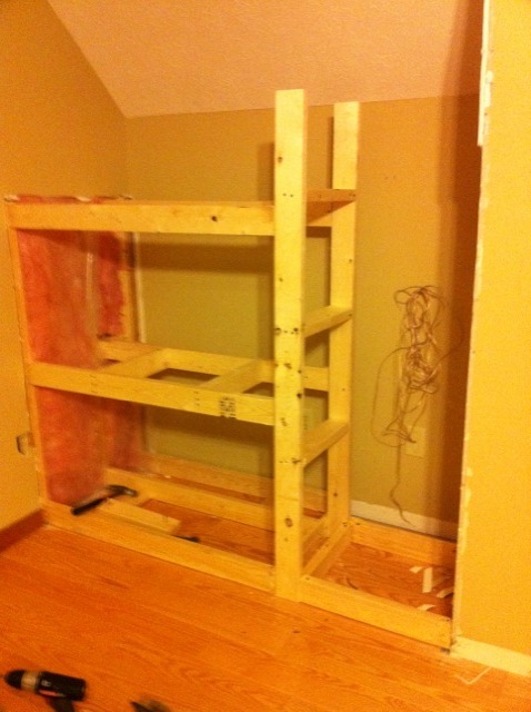Here's what I tinkered around with today...drywall removal and started framing in the shelves on the left side.