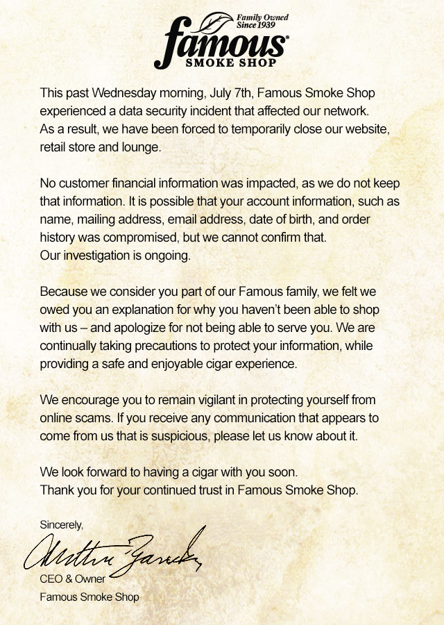 Well if they steal my credit card info, I'm not reporting it. Because the thief will be spending less at Famous than I was . . . .