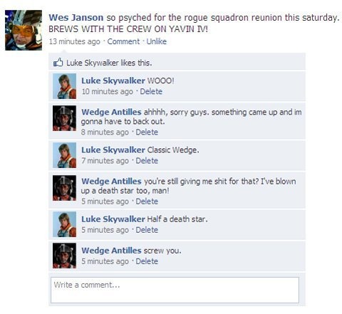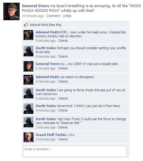 I saw this yesterday. The one where Darth Vader said they should have their settings on private made me laugh so hard I that sarlac milk came out of my nose! LMAO
