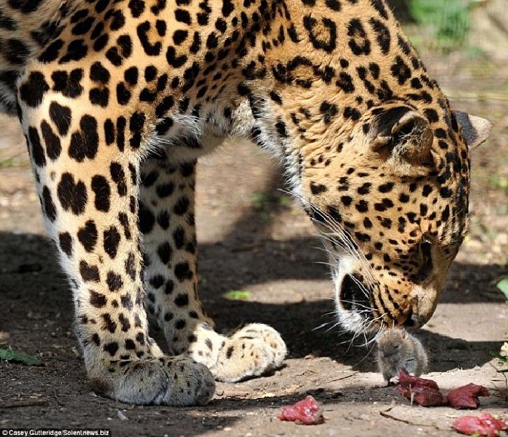 Seemingly unaware of the beast towering over it, the tiny rodent grabbed at scraps of meat thrown into the African Leopard's enclosure. But instead of pouncing on the tiny intruder, the 12-year-old leopard Sheena kept her distance After a few minutes she tried to nudge the mouse away with her nose, but the determined little guy kept chewing away until he was full. [Image 1] The extraordinary scene was captured by photography student Casey Gutteridge Santago Rare Leopard Project in Hertfordshire , England. The 19-year-old, photographing the leopard for a course project, was astounded by the mouse's behavior He said he had no idea where the mouse came from. He just appeared after the keeper had dropped in the meat for the leopard Taking no notice of the leopard the mouse went straight over to the meat and started eating. [Image 2] Even when the leopard bent down and sniffed him, the mouse just carried on eating like nothing had happened. Even the keeper said he'd never seen anything like it before. [Image 3] Project owner Jackie James added: "It was so funny to see - Sheena batted the mouse a couple of times to try to get it away from her food.But the determinedlittle thing took no notice and just carried on. The mouse continued to eat the leopard's lunch and showed the leopard who was boss. We can only assume that Casey received a grade A on his project! |