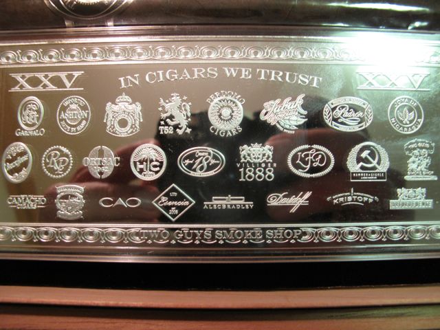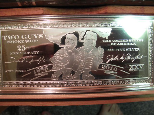 The price of silver today closed at $21.69 and the bars are 4 oz., each bar has the logo of the 25 cigars that helped to support the gala 25th anniversary event, held last Wednesday. Plus the two cigars were made by a never to be disclosed high end manufacturer specifically to celebrate the 25th anniversary. Lastly, there were only a small amount of these boxes made.