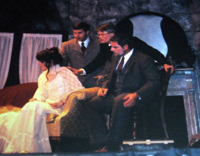 She was blonde and hot. This was in South Alabama, so you know they had a lot of young blondes to choose from. There must have been 20 in this show. I played a real FOP, and you can see how bad it was, the guy in this photo is as straight as me, but a better actor, lol. Second seris is from Dracula, I played Von Helsing, onstage the whole show except for a 1.5 page quick change. Brutal show, but my best role ever. I showed up late to the tryouts and the director had stated unequivocally that there we would NOT be doing accents in the Dracula part. So of course, I get up and read in a crackerjack Bela Lugosi....GREAT, but totally F'ed up. Always come on time, lol. Tried out for the lead, but I was not handsome and slim like Drac had to be, found out that I DID get the lead, and it was V.H, lol. Forgive me, I just shot these pics with a camera on my keyboard in dim light, but they are plenty scary no matter. Want BAD LUCK?? We had to have Dracula break a mirror every night, in an effort to have me NOT see that I could not see him in the mirror. He would shoot a flash paper shot out of his sleeve and the mirror would be broken back stage with a large pointed steel bolt On this night, he made his flourish, fire shot out and then nothing for 10 secs..... Then crack. The audience BUSTED out laughing, as we both stood there as if to say "WAIT for IT!" Last edited by OLS; 05-28-2011 at 09:48 PM. |