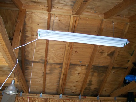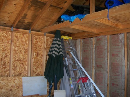 I'm in the process of putting up some paneling over the insulated walls, installing some electrical outlets, and building a bar, I mean, a "storage shelf" that is L shaped on two walls and merges into some shelving on the other wall.