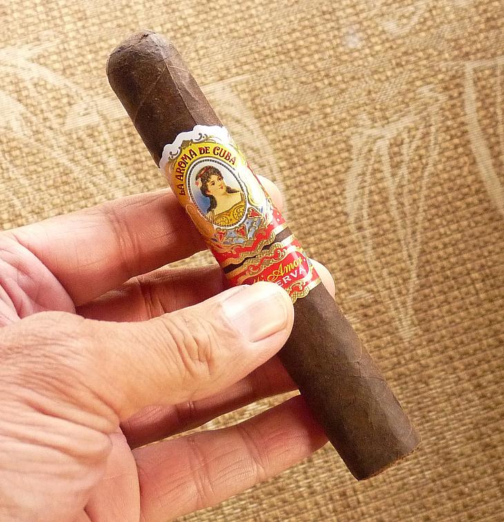 5.5"x54 Strength: Medium-Full Wrapper: San Andres Origin: Nicaragua Shape: Robusto Prelight: Sweet tobacco, cocoa and cedar, slight box press, solid pack 1st 1/3 Perfect draw, dark chocolate, earth, nut, and creamy, no bite, spices in the background, medium/full, lots of smoke production, burning at an angle 2nd 1/3 Very smooth and creamy, maybe a note of syrupy flavor but faint and continuing dark chocolate, earth, nut and spice notes. Burn line self corrected, slight nicotine buzz Some people get a mint note but I can't detect it Overall the flavors could be bigger but it is a smooth smoke Final 1/3 This stick can take the abuse of not going hot when hit to fast, nice trait All the flavors seem to blend but fading together, this was the better of the La Aroma de Cuba brand I've had but not my cup of tea. Smoke time 1 hr 10 min Score 7.5 out of 10