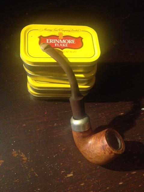 My father in law dropped by this weekend and gifted me one of his pipes (he quit pipes quite some time ago, only smokes cigars now) and some left-over Erinmore Flake tobacco as I recently mentioned I would like to try pipes someday. It’s a Peterson 307 system pipe (not the best for beginners apparently, but it will have to do ):