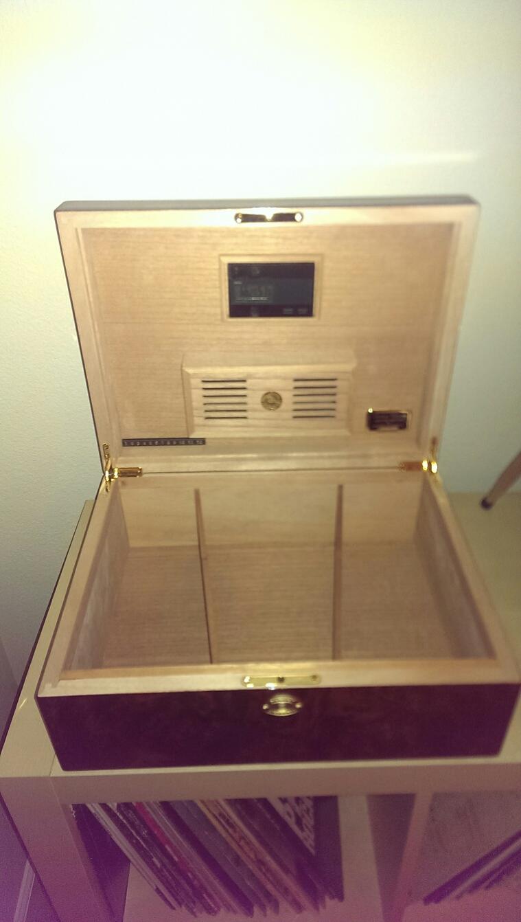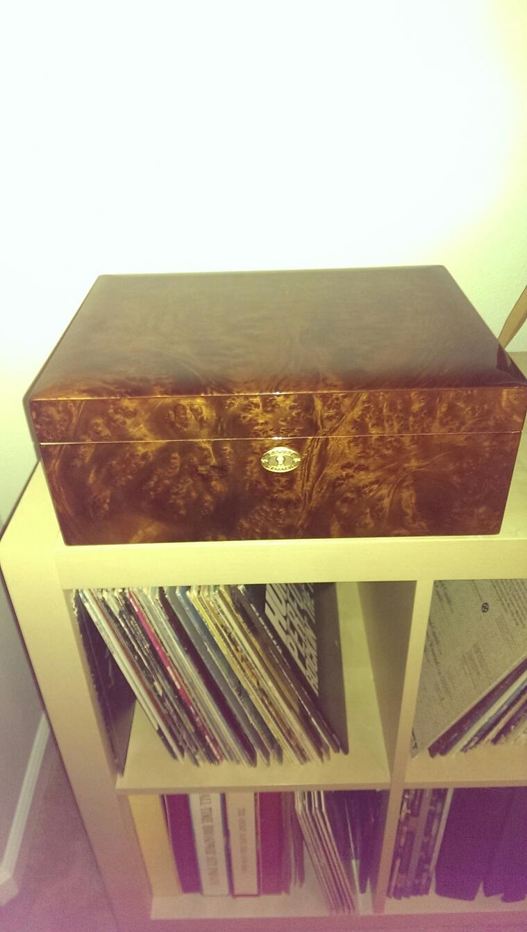 After taking a long break from cigar smoking except for special occasions, I got quite the surprise waiting for me at home one day! Came home to a large box, and inside was a Daniel Marshall humidor, something I've always yearned for but never could justify. Happy to say it exceeded my expectations! Pictures don't do it justice, and after a week it's ready to go. Now comes the fun part of filling, and emptying, it.