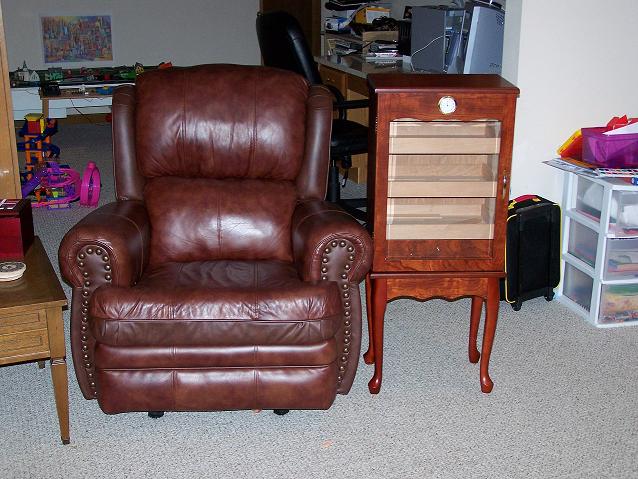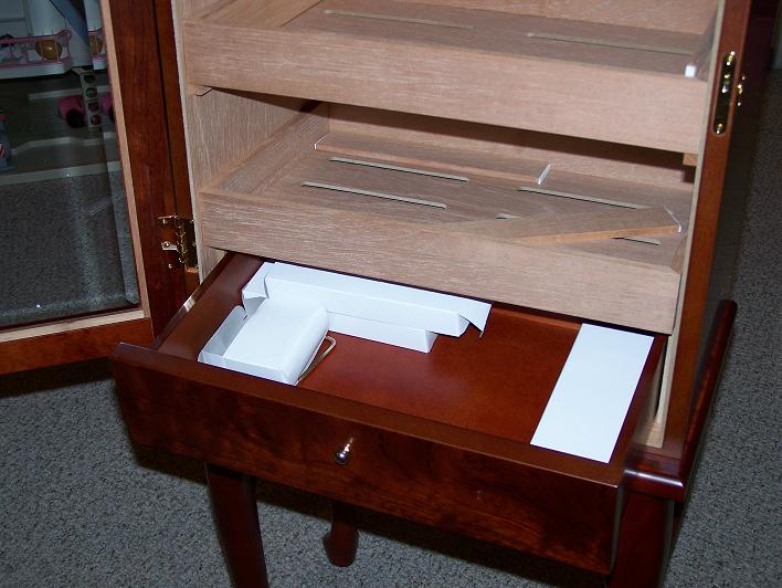 Here it is and I must say I am pretty damn excited! Rolled in last night after my sons baseball practice to see this huge box sitting in my garage...WOW...in my previous thread I had asked for some advice and people asked me where I got this monster and to report when I got it. Let me just say that for a 600ct Humi that was supposed to retail for over $600 that getting it on sale for $150 I was a little skeptical....especially since I had not done any business with this firm before. I ordered it on Thursday, got the tracking number on Friday, and recieved it at my door Monday (shipped $36). It weighs about 55lbs and all you have to do is put the legs on. It has a removable hygrometer (as most do) and 3 large rectangle humidifiers for your di water...even has a built in lock and key (for those of you that have kids). I am very please with the overall quality. It has 3 drawers that are deep, easily fits a few boxes and you can stack a few high as well, has dividers, all spanish cedar lined, and a drawer on the bottom to keep any of your cigar accessories. I researched and I could not find another fancier looking humi that your "fit in" with furniture...this does the job well...now on to filling it up!