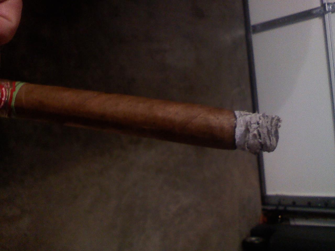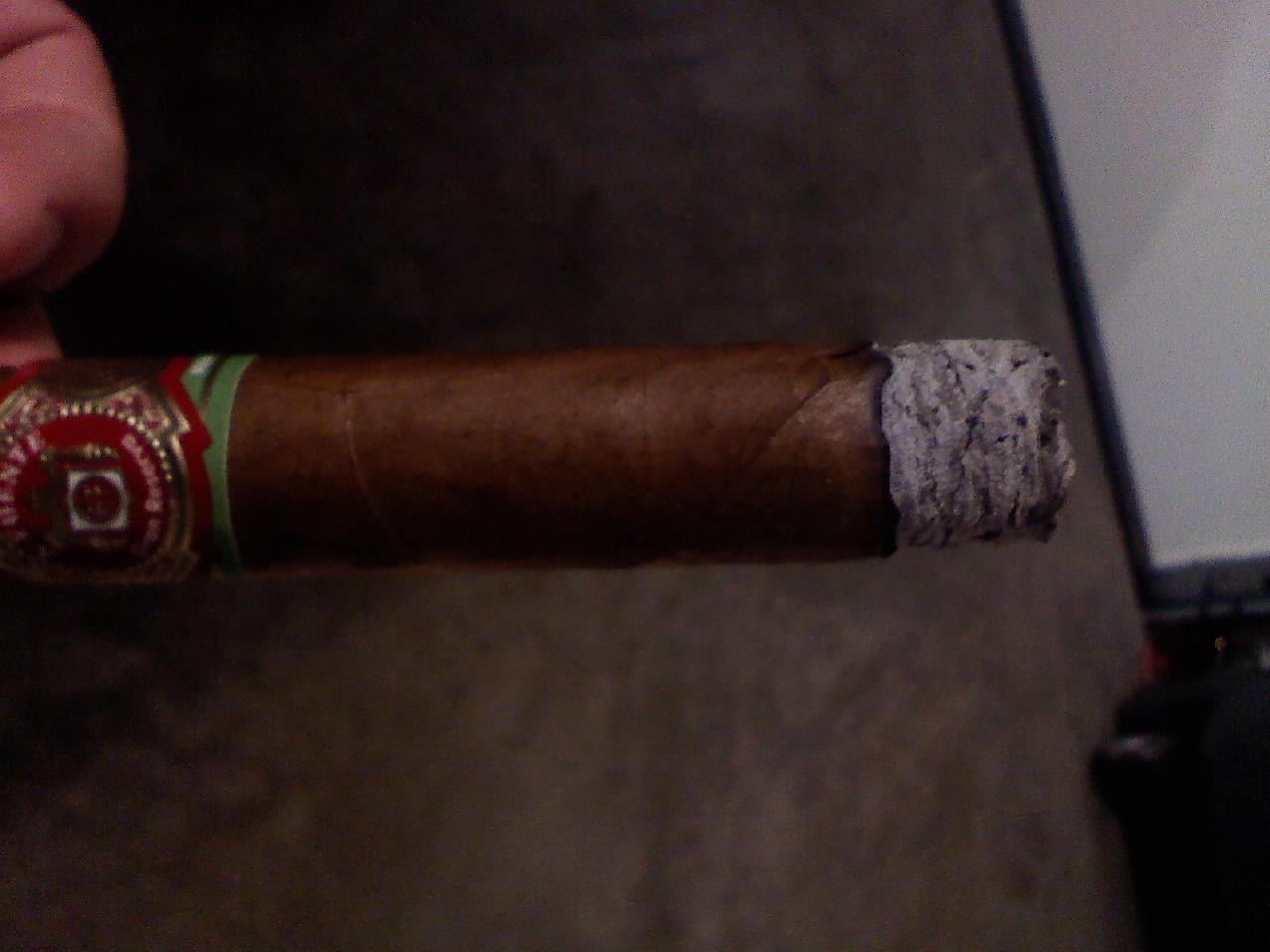 The cigar had a great looking wrapper after sliding it out of the tube. No veins or blemishes on the wrapper 7 x 49. The predraw was very nice, not tight or loose, just perfect. The first draw from the cigar, I was getting a little pepper and what seemed to be a woody taste. (I am new at smoking cigars, so my tastes are still building.) After about the 5th draw or so, the pepper was gone and it just seem to be a mild wood flavor. The smoke was very thick. The 1/3 was very consistent with no burn issues. The ash was light gray and seem to flower a little bit, but hold pretty well. 2/3 - the flavor didn't seem to change and the burn was still solid, with no touch up needed. The ash was still flowering a little. The smoke was still thick. The final 3rd flavor seem to change and to a leathery tabacco. This flavor lasted to the finish of the cigar. The cigar took about 2 hrs to smoke and I would say it was a mild to medium smoke. Very good flavor.