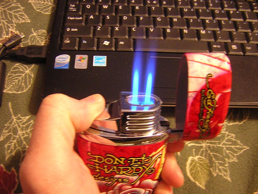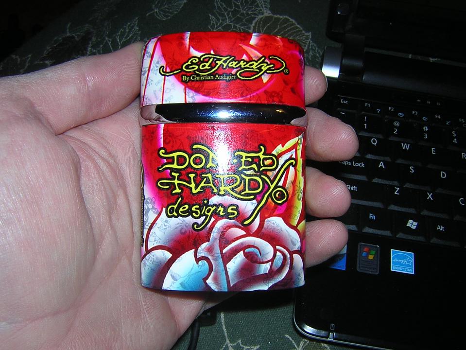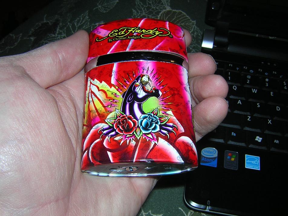 Ok so I'm a fan of tattoos and tattoo inspired art/gizmos but I've found that I am not a fan of Ed Hardy designs by Christian Audigier because of the people who buy his goods, most are mainstream upper middle class with money to buy an "alternative" look to make them seem "hip". Growing up Punk and poor and never having money to burn gives me an extreme appreciation for what I have and what I can't, and 120$ for a t-shirt is crazy and irresponsible for me to spend....but today at a Giant convenience store I found sitting by the registers a selection of Ed Hardy table top 2 jet lighters, and I had to have one! So 24.95$ on my credit card later and I'm the slightly embarrassed owner of a cheaply made but colorful lighter with no warranty, the flame is HUGE and and the design is Traditional tattoo and I love it.