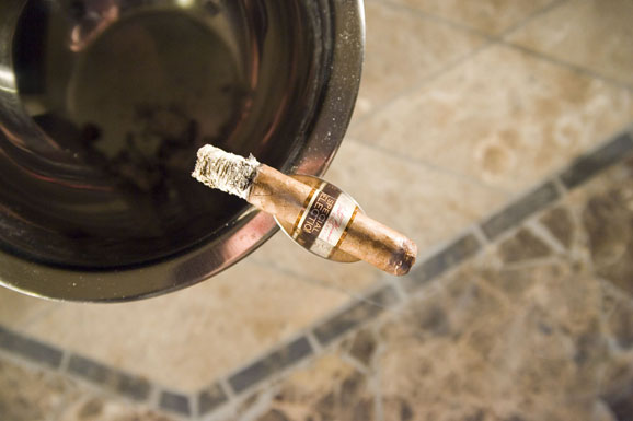Length: 165/7.5 Ring: 40 Vitola/Name : Lonsdale / Lancero Wrapper: Nicaragua Binder: Nicaragua Filler: Dominican Republic, Honduras, Nicaragua Prelight/Construction: Beautiful Colorado Maduro wrapper. This cigar is firm from head to foot, the wrapper has a nice oily sheen and some predominant veins. Nothing much for aroma or prelight draw. I am very much looking forward to this cigar. I have never smoked one before but have heard some good reviews. First Third: Upon lighting this cigar I get some woodsy and tobacco flavors, the aroma is very nice and smells sweet I hope that is a hint of what is to come! This cigar gives tons of smoke. The ash is pretty firm and almost pure white. The flavor remains the same throughout the entire first third of the cigar, woodsy and tobacco with a very short finish. Over all I am not very impressed with this cigar so far, but hope for goodness to come! Second Third: Flavor remains the same, and the ash although it looks firm only holds up to maybe one inch. During this third I occasionally begin to get hints of sweetness which is on par with the aroma. The burn is fairly erratic but seems to correct itself every time before I have to touch it up. I am pairing this cigar with water, it is fairly mild so I think a red wine would overpower it. A mild beer may be a good pairing to try. I am still somewhat unimpressed, the flavor is nice but not complex at all. Last Third: In the last third the cigar began to give me a bit of pepper on the tip of the tongue, it was short lived and went back to woodsy and tobacco flavors, the hints of sweetness have stopped also. With about two inches left in the cigar the flavor became bitter with a taste of cardboard. I had to put this one down early. Conclusion: (Not Recommended/Pass) Although I was really excited to give this cigar a try, it was a dud. It had a nice woodsy tobacco flavor but that was it.