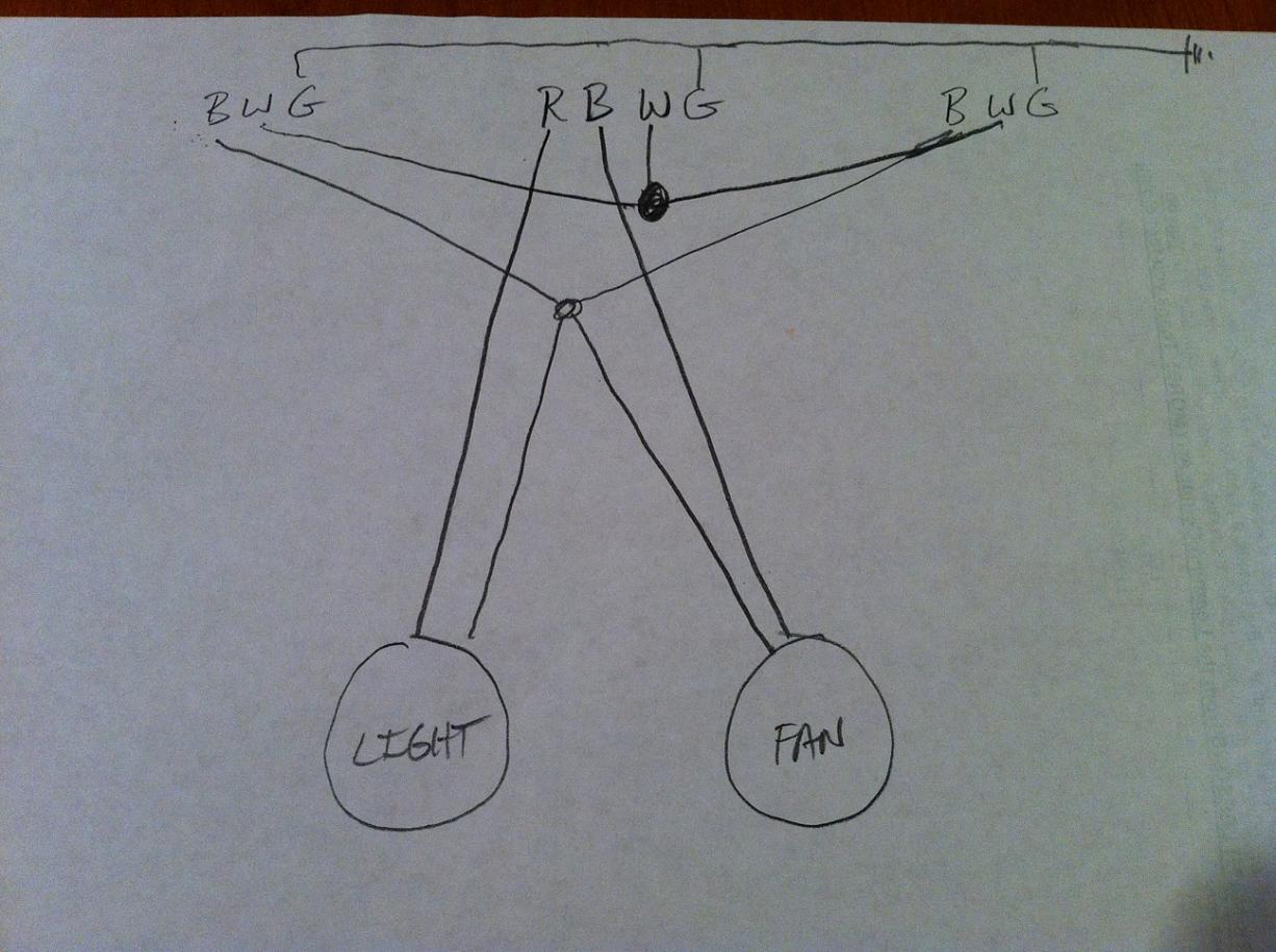 3 wire sets- Set 1 has a red/black/white/ground Sets 2 & 3 have a black/white/ground Light switch has red from set one and black spliced from sets 2 & 3 Fan switch has black from set one and black spliced from sets 2 & 3 Whites from wire sets 1, 2, and 3 are spliced/capped Grounds from wire sets 1, 2, and 3 are grounded to one another. So, when it comes to the black wire from the outlet box not accounted for in my installation instructions, the red is obviously a hot for the light, so is there any harm in tying in the hot for the fan? |