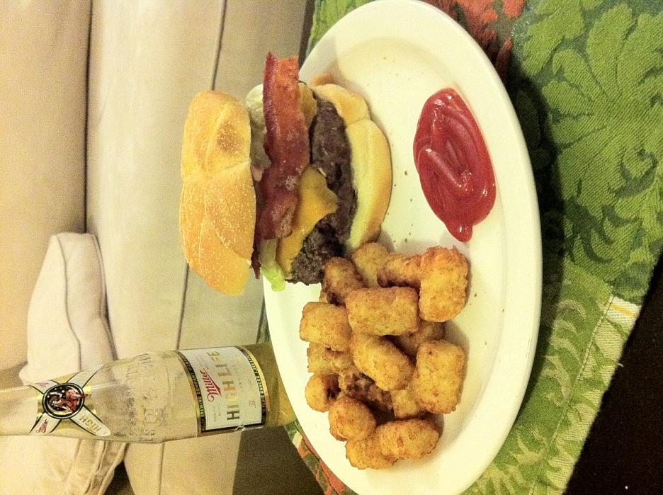 Just your good ol' American Bacon Cheeseburger. No frills, just thrills. About a 1/2 pound of 90% lean Angus Ground beef, 2 Slices of Extra sharp Cheddar, 3 slices of bacon, red onion, iceberg lettuce, vine ripe tomato, Ketchup, Mustard and a little Mayo on a fresh Kaiser. Served with a side of Tots and an ice cold Miller High Life. Not sure it gets much better than that. |