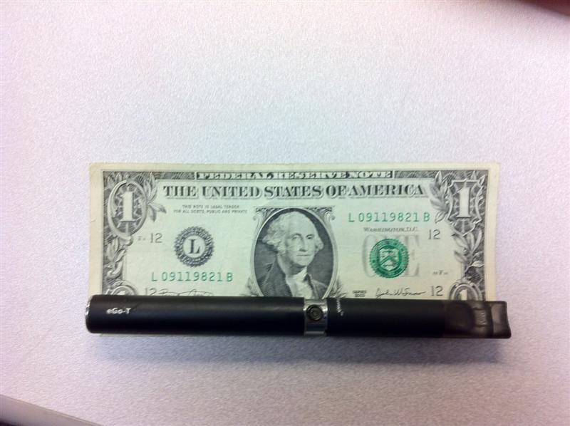 Heres a pic of my 1000mah eGo-T next a dollar bill to show approx size. Once charged, it should last you pretty much all day. Also with the tank system, a full tank should last a day as well.