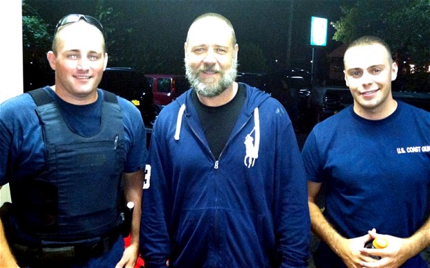 "Sept. 2, 2012: A photo provided by the U.S. Coast Guard shows Russell Crowe, center, with Coast Guard petty officers Robert Swieciki, left, and Thomas Watson. (AP2012)"