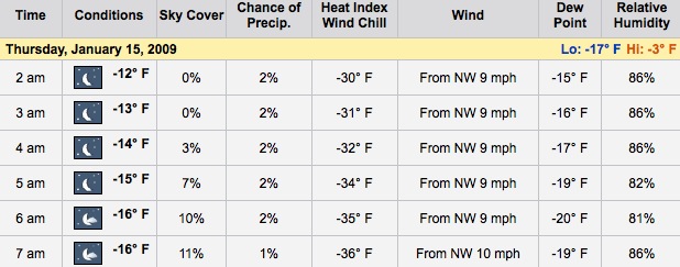 Don't worry though, the cold snap is almost over. Friday we are up to a balmy 7*F.