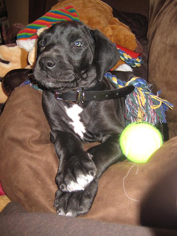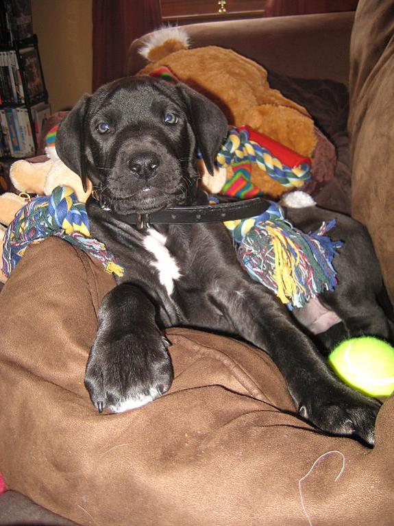 ![]() Dante is a 10 week old Great Dane puppy. We have had him for 2 weeks now and he has already put on 7 pounds, with an expected adult weight of 170-180 pounds!! ![]() To say he is a handful would be a HUGE understatement. My wife and I are focusing the majority of our time training him, because anyone who knows the Mastiff breed knows that an untrained one is a bad one. I'm planning on updating this thread to track his growth until adulthood.Dante is planned to be bred with a Blue and Harlequin Dane a couple of years from now...so I'm sure there will be more puppies in our future. ![]() The first two pics are from when we got Dante at just about 8 weeks. The last two pics are from last week at 9 weeks. Look at that growth!!