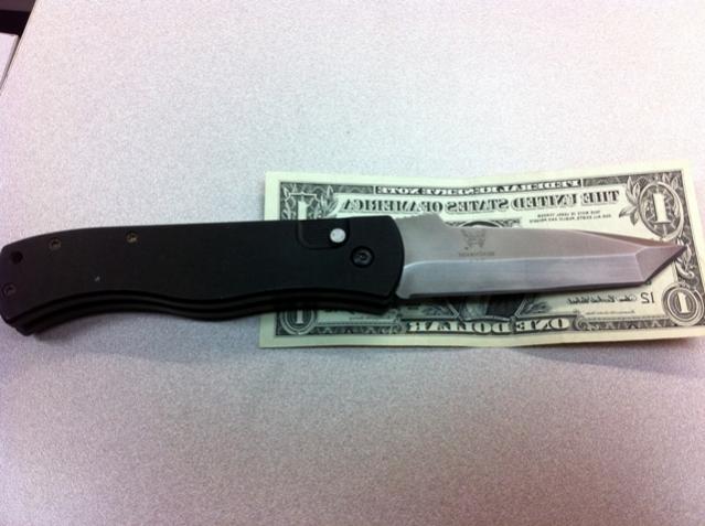 Losing money? How? Got the Benchmade today. It is freaking tiny.. Way smaller than I was thinking for some reason, Returning it for this knife, but black on black with silver screws, plain edge.