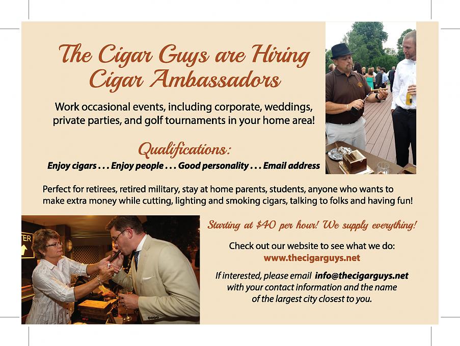 THE CIGAR GUYS ARE HIRING EVENT CIGAR AMBASSADORS ALL OVER THE COUNTRY. Great for Retirees, Students, Disabled*, Veterans, anyone who enjoys cigars, talking to people, and want to make extra money (starting at $40 per hour). You will provide cigars or accompany a live cigar roller to events, wedding, golf tournaments, corporate events and wedding receptions. GREAT EXTRA INCOME!