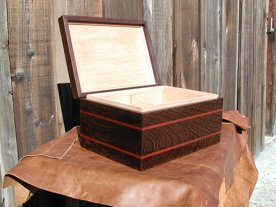 Decided to make my older brother a desktop humi. Never made one so i looked around and just took ideas from other ones I'd seen. Definately knew i was going to use solid wood and not laminents and I don't like staining so I looked for wood with interesting grain pattern. I found an awesome piece of wenge that was just screaming to be made into a humi. Used a little sipo to add some contrast to the wenge. Here's some pics of the outside.