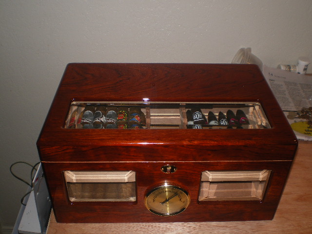 The top two shelves are boxes in waiting. The third from the top is stuff I am currently smoking except for the Cazzies and Dukes. The next one down is mostly Tat stuff and a couple of DPG boxes. The next one down has some Opus, Anejo stuff, and my Snus. The bottom has a bag of my wife's stuff. The left singles drawer is NCs and has trays to keep it somewhat organized. The right singles draw has no sense of order at all!!!