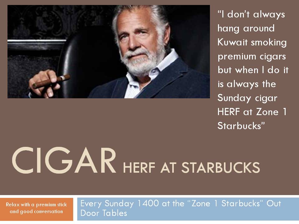 Well our merry band grew to three today and during my second stick I believe I recruited two more. Ladies and gents we have our selves a HERF. Any brothers or sisters coming Camp Arifjan way feel free to join us at the "Zone 1" Starbucks at 1400 on Sundays.