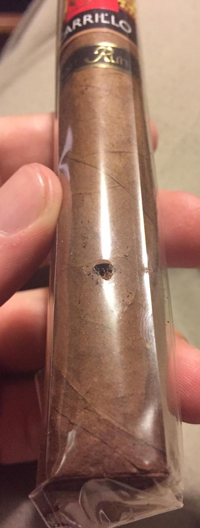 Cigar with hole through cellophane.