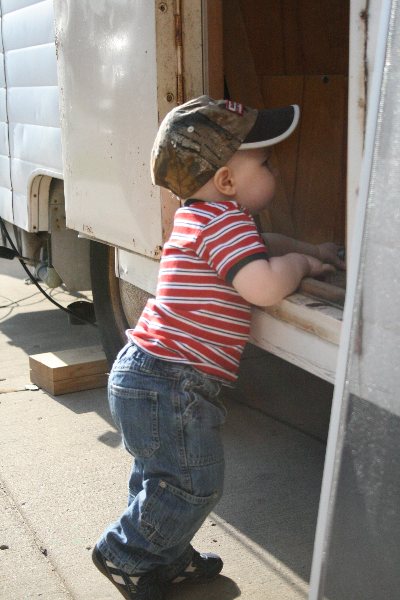 My Grandson Daniel, helping me with restoration of my camper/herfmobile.