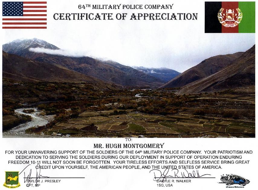To all the other supporters who sent smokes, I sent you a Certificate of Appreciation as well from my Commander and self. Thank you for all your support.