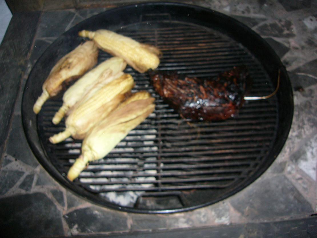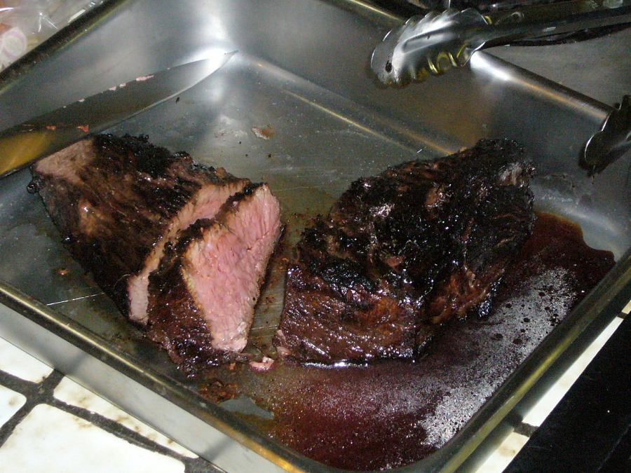 Here are a couple of shots from last night. Sorry about the fuzzy photo. I left the tip of the meat over the coals longer for those who like their meats destroyed. I pulled the tri-tip out at 135 instead of the intended 130. I got side tracked although I was carrying the remote temp receiver on me. I didn't set the beeper. |