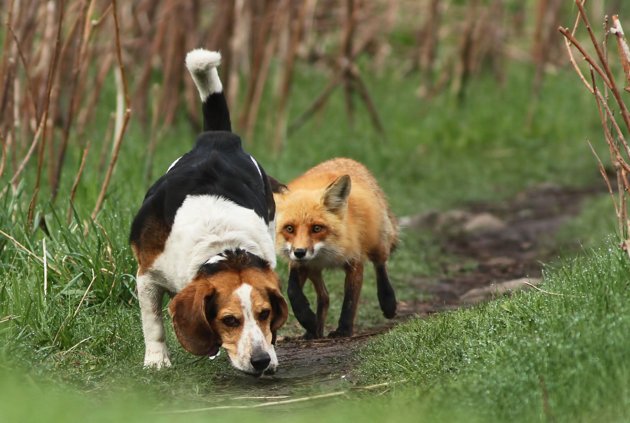 In an unusual role reversal, a fox was spotted trailing a beagle in a forest near Montreal, Canada. The odd fox behavior was an effort to protect four newborn fox cubs nearby. The photographer noted that the fox outwitted the dog and saved the family. “It was the first time in my life when I saw foxes so brave, who managed to fight back in front of a hunting dog.” (Photo: Mircea Costina / Caters News )]