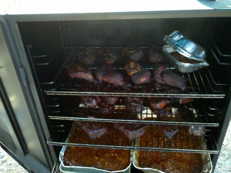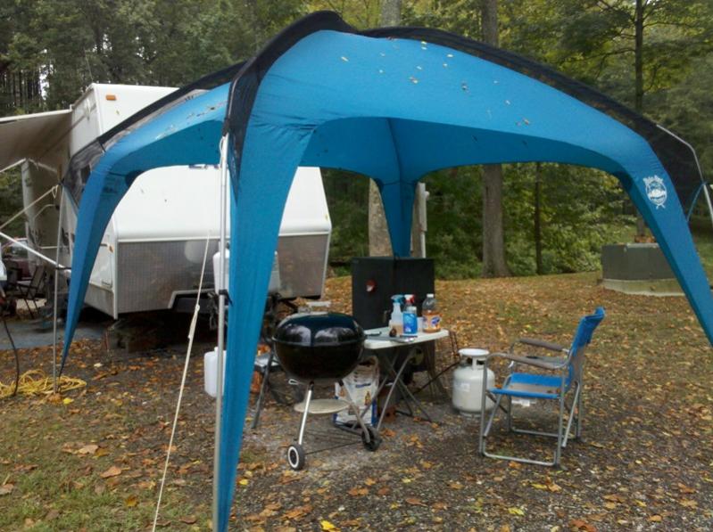 A pair of whole beef briskets... Country style ribs with my famous beans... When I'm doing serious cooking, I put up my smoke shack tent... keeps the sun off of my drink. ![]() |