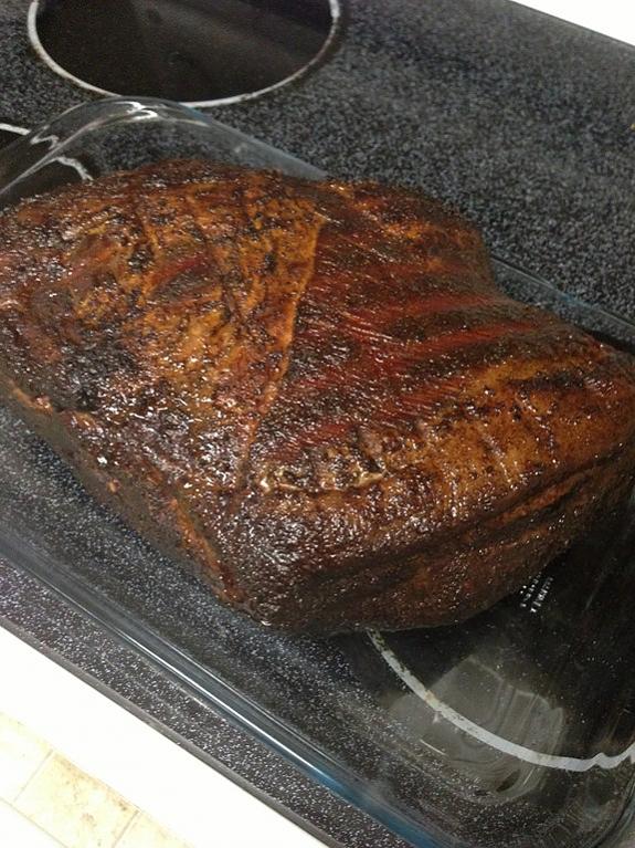 it smoked for about 12 hours btw, left it a tad underdone, (pulled and wrapped in foil at 160) since it was going to be reheated the next day.. we cut it up and finished it in the oven at the host house. I threw a few friends on teh smoker while I was at just because i had the room and it ended up being my dinner saturday lol.
