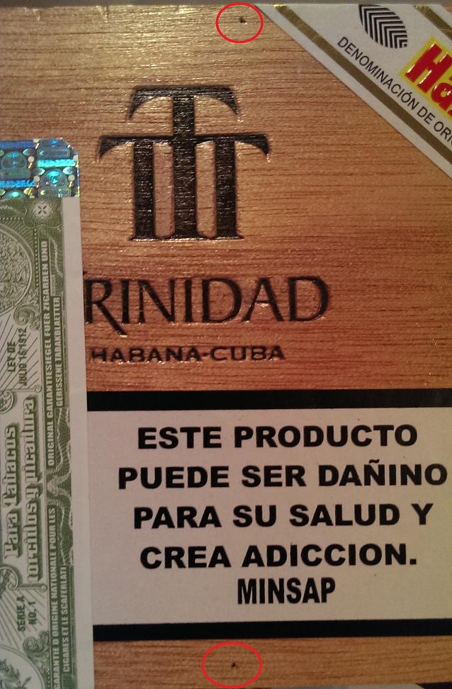 As I am in a quasi-panic mode, I will do the formalities later. Basically today I noticed 2-3 pin-sized holes on the edges of a box of 12 Trinidad Reyes. Oops! I live in Edmonton, AB - in Canada! - and have the luxury of getting Habanos here. On the front of the box: Opening the box, the holes are burrowed in the panels just underneath: Top hole: Bottom hole: Anyways, The pictures are quite explanatory. I received this box and few others 3 days ago and they were brought directly from Cuba last Friday and sitting in Ziploc bags without any humidification till I got them New Year'd Eve! I really didn't pay close attention to this or the other boxes when I received them. I usually store all the sealed boxes in my 500 cc display humidor -bought and seasoned over one week ago - and use Cigar Oasis XL plus for humidification at 70Rh. The boxes I open, I prop it open with a matchstick and leave the cigars in the boxes. So I smoked one and put the box propped open back in the humidor. Then I had this urge of looking at the production date and that's when I saw those hellish! holes. I have never encountered cigar/tobacco beetles but I've been warned a plenty and looked at enough -heartbreaking and painstaking - pictures of beetle-infested cigars. I inspected all the cigars and they are all intact and no holes or burrows in them. I inspected another box - from the same delivery - and I saw one of those holes on the edge of another box. Then I was near panicking! Basically I was thinking of emptying my humidor, wipe it clean, taking the cigars out - even thinking of the deep-freeze beetle-kill method -. As I was breathing shallower and my head in a frenzy; I remembered I have a smaller 100 CC Milano Humidor with couple of boxes of Habanos in it. For that one, I use the smaller Oasis Ultra and 70Rh. So I am taking the boxes out and notice same pin-sized hole, relatively in the same location on of the other boxes! As alarming as this was, there was a bit of relief as the latter box has been sitting sealed in my humidor for over few month and so far no beetle infections. Yet I worry, did I unleash this hellish armies of cigar beetles into my new humidor? Will it burrow holes in the cedar of my humidor? Has anyone encountered these before? Any help or comment is most appreciated. |