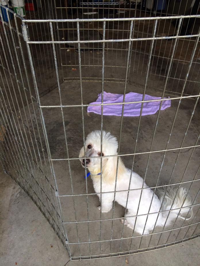 Dug in quarantine (in our garage) after getting blasted by a skunk earlier this week... If you look closely, you can see the yellow residue on his neck and chest. Unfortunately, we did not figure it out fast enough and he managed to rub it on the carpet...