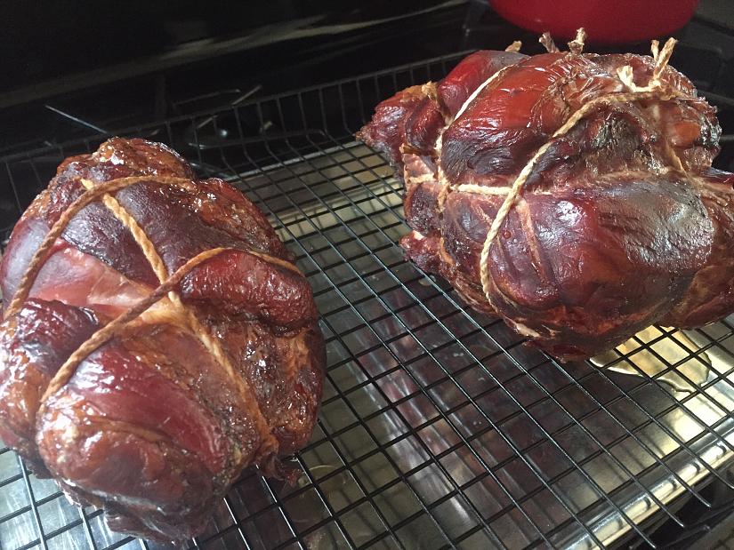 Did two ~2lb hams for dinner tomorrow. Brined in a maple/bourbon brine, smoked over apple wood.