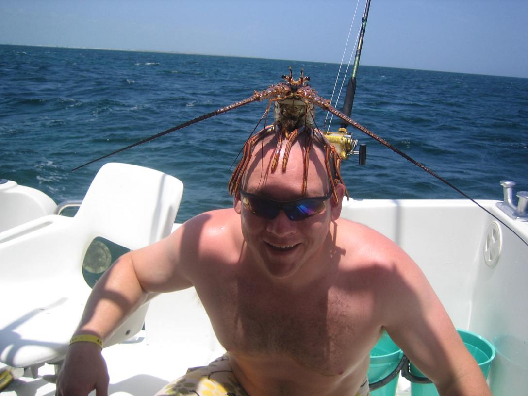 Deep sea fishing in ISOM, wearing lunch to keep the sun off my head.