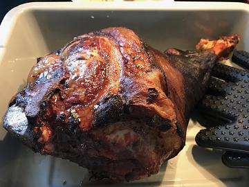 Mojo criollo marinated pork leg. Just put on about 15 minutes ago. Going to roll at 225 for a few hours then bump it to 275-300 to finish.