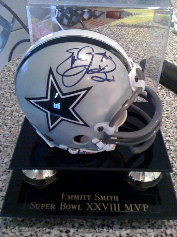 My wife has often accused me of collecting crap. I can't argue with her as evidenced by the photo of the signed Smith mini helmet that my son had the displeasure of getting from him in person, for $100 no less. If they win it all, I am going to try to convince my son to let me raffle it off to the Cowboys fans on this thread. I hate this freaking thing in my house. Actually, my son in law will claim it long before I can box it. And to think, I have to put up with my 2.5 yr old grandson with a freaking Romo jersey. That should be considered child abuse.