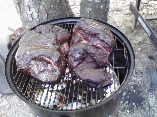 picked up a double pack of butts, and a chuck roast. froze one of the butts, and smoked the other. sorry, forgot pics of the chuckie before it was eaten... butt should be done shortly.
