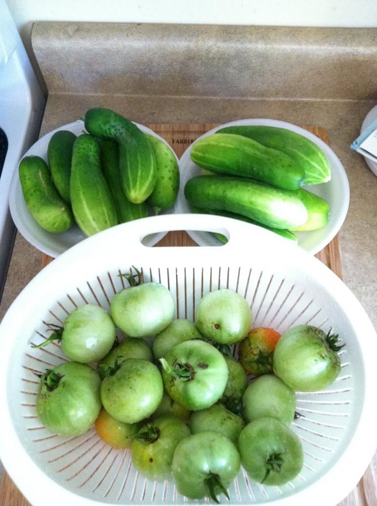 I did get some cucumbers and tomatoes today. Heat is killing my tomatoes so I picked them green so id have a chance to use them before they split. |