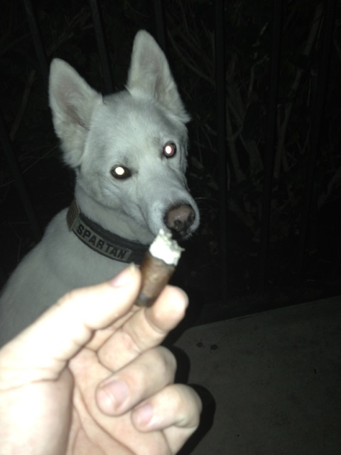 Then went to my buddy's apt and we smoked a few on the patio. Started a Cohiba "NC" red dot....meh. Then a 5 Vegas Cask Strength....milder than I remember. Could have been the spicy chinese food we had earlier that had something to do with that. Finished the evening with a MOW Puro. Unbelievably good. NUBBED that sucker...I flat ran out of fingers. His husky, Spartan making a cameo. |
