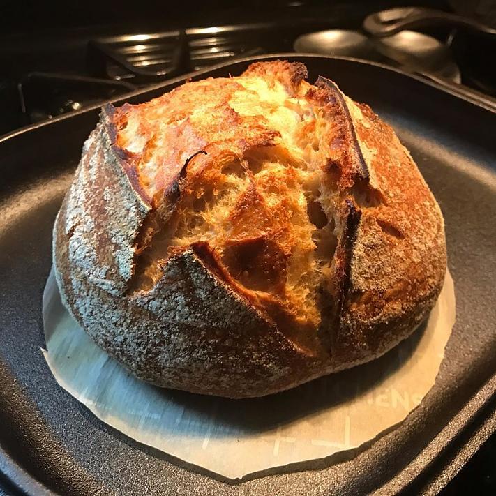 Bought a new cast iron bread pan last week, from Challenger Breadware. Got to put it to use with another sourdough loaf. Big improvement over the previous loaf. Partly due to a longer proofing, but also from the pan. Allows me to crank the over to 500F, without fear of cracking the pan. With the dutch oven, I'd only go to 475F. And the pan holds the heat a lot better.