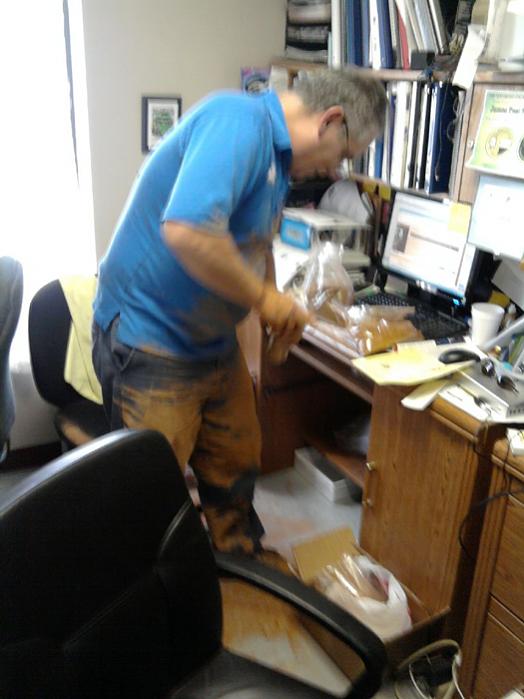 I need to make a giant bulk batch of rub. So I get a big bag done and think, hell, why not do another bag. So I am mixing and shaking and sqeezing and WHAMMIE! Whoosh, 45 bucks worth of rub flies into the air, coating my shirt, pants, in my shoes, on my chair, in my keyboard, in my nose. So naturally, I just BUST out laughing and everybody around me busts out too. We are all sneezing and wiping our runny noses and laughing and our sides begin to hurt. So I clean my chair with some upholstery cleaner, have the guys out in the kart shop blow me off with compressed air, sweep and mop the area and it is done for now. Everybody says it smells great. TODAY. In the weeks to come, I have a feeling that I am going to be pubic enemy number one. Anyway, here's a picture. |