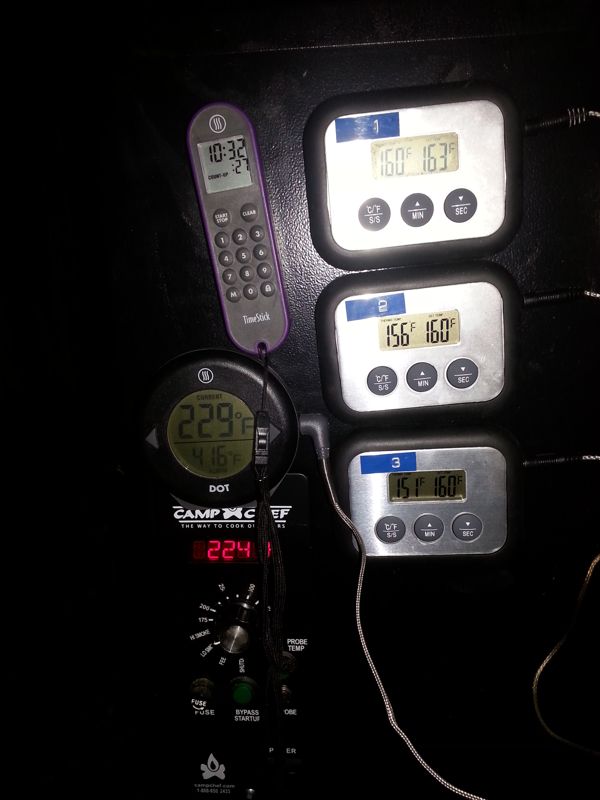 After 4 hours Finally hit temp @ 10-1/2 hours after I bumped the smoker up a few degrees at the 8-1/2 or 9 hour mark... Oh yeah... |