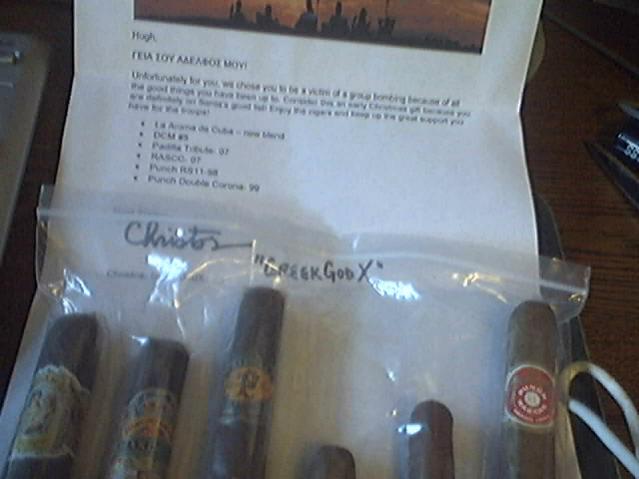 Christos(GreekGodX) sent along a new blend Aroma de Cuba(a cigar I've been wanting to try as I love the original blend. I understand there is now even a thirs blend!), a DCM#5(best band!), a Padilla Tribute from 07, a RASCC from 07, a Punch RS11 from 1998 and a Punch Double Corona from 1999. A great selection for which I say Ευχαριστώ very much, αδερφός!