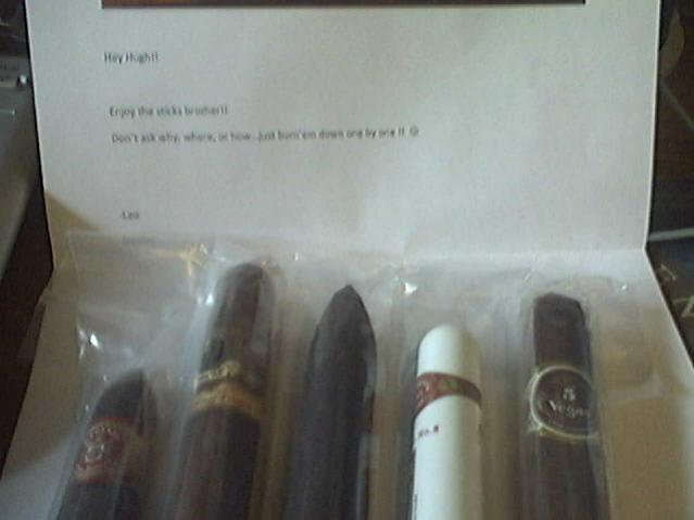 Leo(LeoM) blasted me with a very nice fiver including a Fuente SS, a Padilla '68, a Cain Maduro(Danger- even Dan got whoozy smoking these!), a RyJ#2 tubo, and a 5 Vegas Cask Strength( another smoke that looks very interesting and somewhat dangerous!)